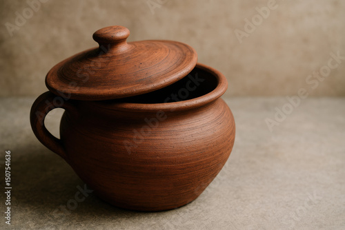 Rustic Pottery: A beautifully crafted, open earthenware pot, its rich terracotta tones accentuated by a simple lid, evoking a sense of tradition, homeliness, and the beauty of handmade artifacts.