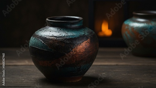 Rustic pottery piece with a black and copper textured finish, shown with a warm glowing background and additional pottery items.