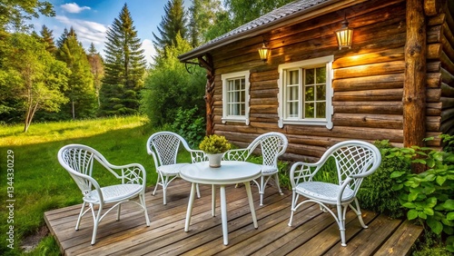 Rustic Relaxation: White Rattan Chairs & Table by Wooden Log Cabin - Drone View