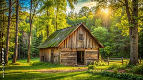 Rustic small wooden barn house surrounded by trees , quaint, cozy, countryside, rural, architecture, wooden