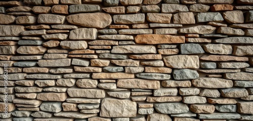 Rustic stacked stone wall, varying shades of grey and brown, rough texture, old, stone