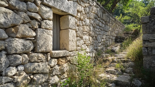 Rustic stone wall with overgrown greenery and window in a serene natural setting showcasing ancient architecture and timeless beauty