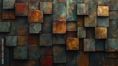 Rustic textured metal cubes form abstract wall deep jewel tones. AI Generated