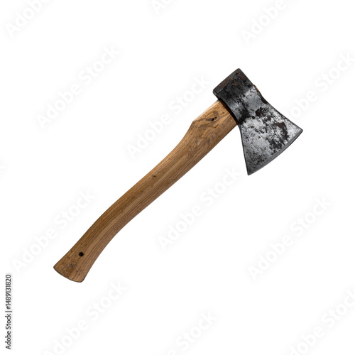 Rustic vintage hatchet axe with wooden handle isolated on transparent background