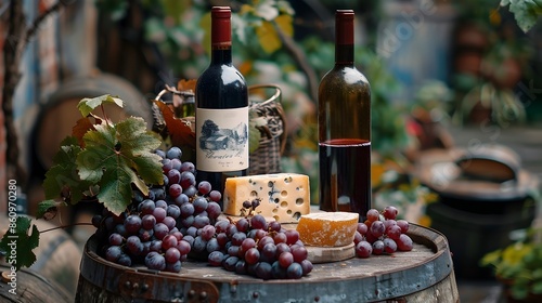 Rustic Wine Barrel Table with Gourmet Cheese and Grapes in Outdoor Setting