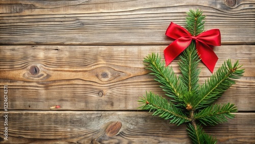 Rustic Winter Holiday Scene with Evergreen Branch and Red Bow on Wooden Background