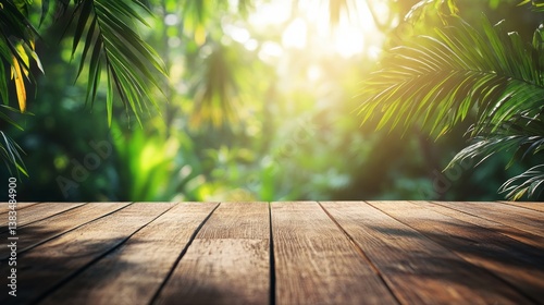Rustic wood deck with vibrant tropical leaves in soft-focus background, bright morning light generative ai