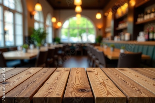 Rustic wood table, blurred restaurant backdrop, texture, rustic, warm