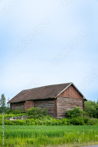 Rustic Wooden Barn Amidst Lush Greenery Under a Cloudy Sky