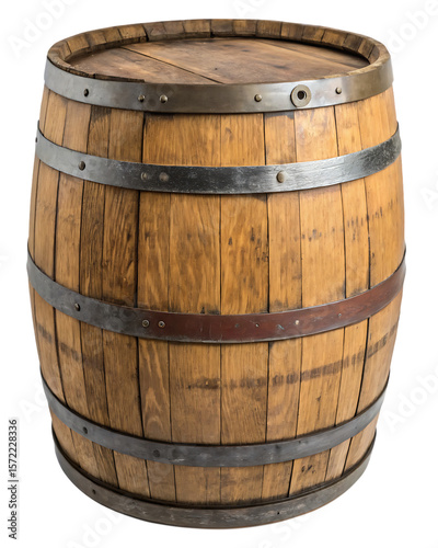 Rustic wooden barrel with metal bands and a circular opening on top isolated on a transparent background