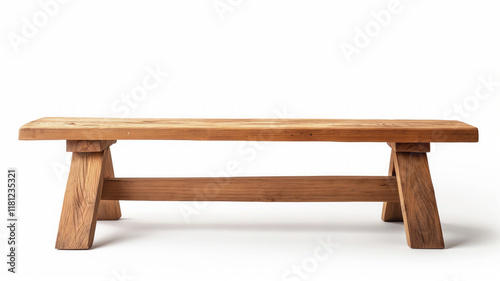 Rustic wooden bench with sturdy legs and a simple, robust design. Showcases natural wood grain and handcrafted details
