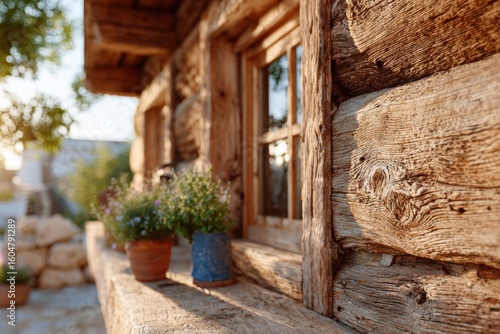 Rustic Wooden Cabin Exterior with Flower Pots on Sunny Day, Emphasizing Natural Materials and Charming Architecture in Scenic Outdoor Setting