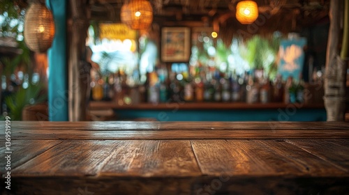 Rustic wooden counter in the foreground, tiki bar with bamboo accents and blurred tropical decorations in the background, daylight