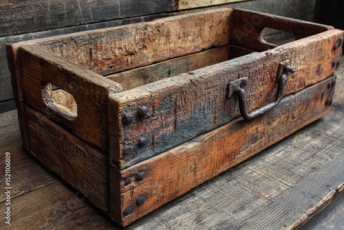 Rustic wooden crate with metal handles resting on a weathered wooden surface in a cozy interior setting