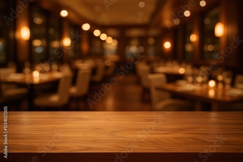 Rustic wooden display table with soft focus restaurant interior in warm ambient lighting