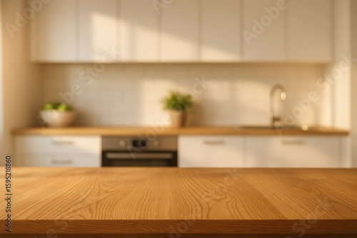 Rustic wooden kitchen table surface with soft-focus culinary background and natural window lighting
