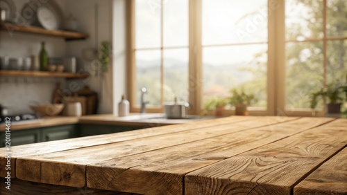 Rustic wooden kitchen table top with a blurred background of a bright and airy kitchen with a view of nature outside the window