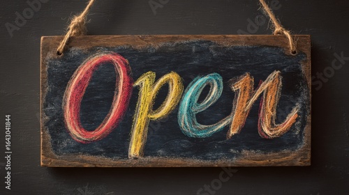 Rustic Wooden Open Sign Hanging Chalkboard Textured Background Colorful Handwritten Typography