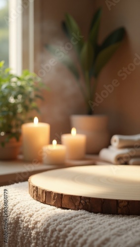 Rustic Wooden Slab with Candles and Plants in a Serene and Natural Setting