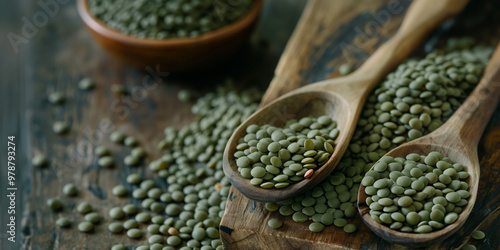 Rustic Wooden Spoons Filled with Fresh Green Lentils on Wooden Board