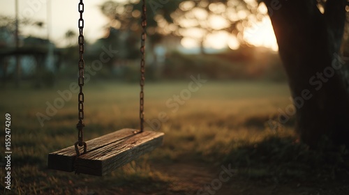 Rustic Wooden Swing Hanging from Tree at Sunset in a Peaceful Countryside
