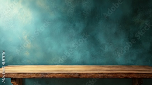 Rustic Wooden Table Against Teal Textured Wall Background