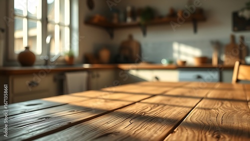 Rustic wooden table bathed in morning sunlight, creating a cozy and inviting kitchen atmosphere.
