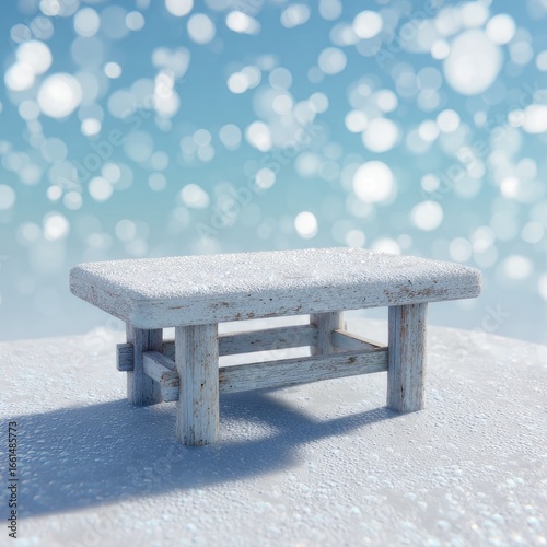 Rustic wooden table covered in snow, on snowy ground, with a soft, bokeh-filled, light-blue background