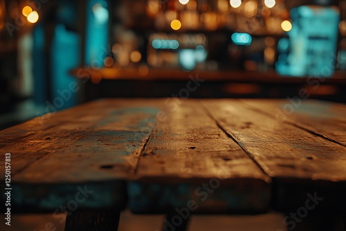 Rustic wooden table in a dimly lit bar, bokeh background.