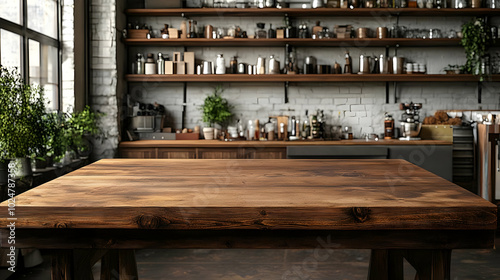 Rustic wooden table in a stylish kitchen with shelves of jars.