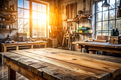 Rustic Wooden Table in Sunlit Workshop - Ideal for Product Display