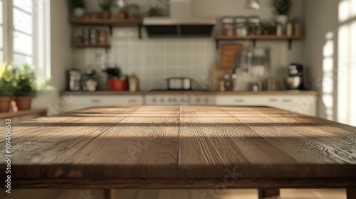 Rustic wooden table in the foreground with a softly blurred kitchen scene featuring shelves, plants, and various appliances in the background.