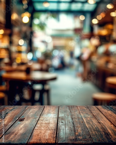 Rustic wooden table surface with blurred cafe interior background warm inviting atmosphere perfect for product display or food photography and restaurant promotion