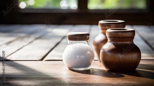 Rustic wooden table with a vintage style glass sugar bowl and matching salt shaker set against natural lighting for a simple elegant still life composition