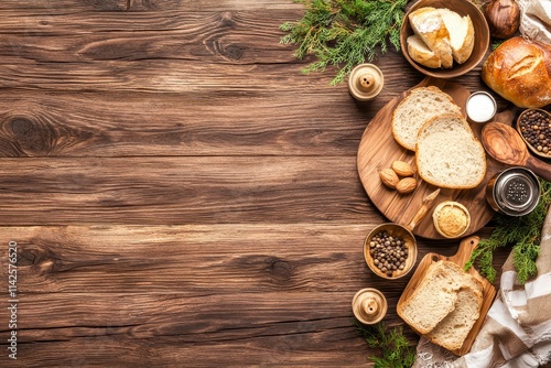 Rustic Wooden Table with Freshly Baked Bread and Spices.
