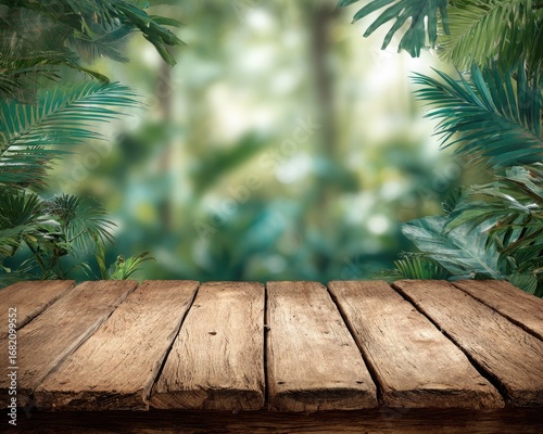 Rustic Wooden Tabletop Display With Tropical Background