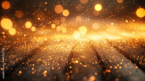 Rustic wooden tabletop surface, dreamy blurred celebration backdrop, floating golden light particles, soft bokeh effects, premium product display setting, warm atmospheric lighting, dimensional