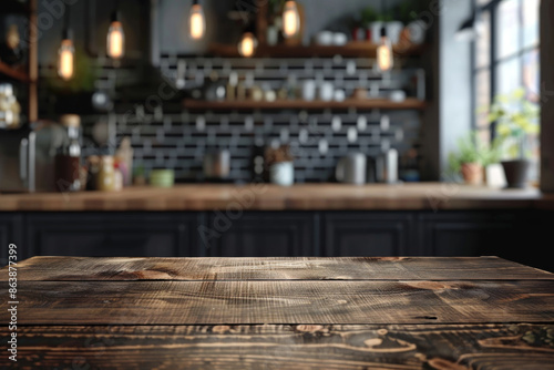 Rustic Wooden Tabletop with Blurred Kitchen Background