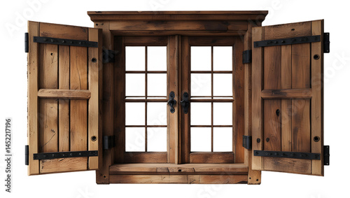 Rustic wooden window shutters open for home decor and design elements on transparent background