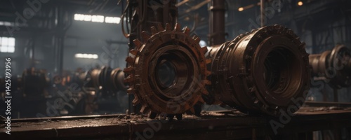Rusting gears, dripping pipes in a dimly lit factory , deterioration, setting, wheels