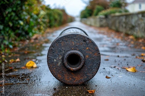 Rusty cannon rests on a wet pathway lined with foliage in a quiet, historic area during a rainy day