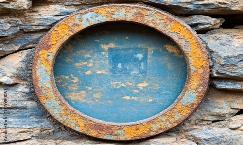Rusty circular window in stone wall, reflecting blurry scene. Use Texture, background