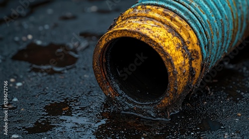Rusty drainage pipe discarded in oily puddle on dark ground