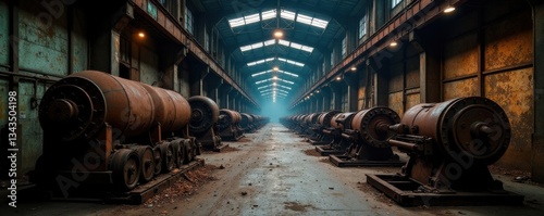 Rusty industrial machinery in a dimly lit abandoned warehouse, warehouse, industrial, machinery