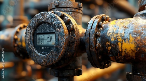 Rusty Industrial Pipe with Digital Meter and Flanges