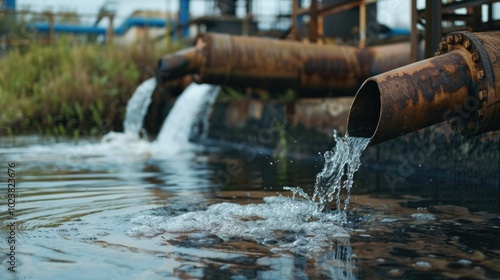 Rusty industrial pipes discharging wastewater into a nearby river, highlighting environmental pollution. Water contamination and environmental hazard evident in the scene