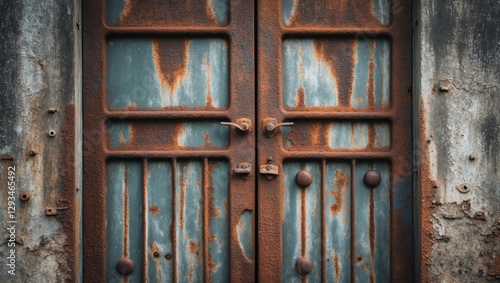 Rusty metal door with peeling paint and texture details showcasing weathered industrial elements and aging effects on the surface.