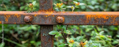 Rusty metal fence overgrown with greenery in a natural setting