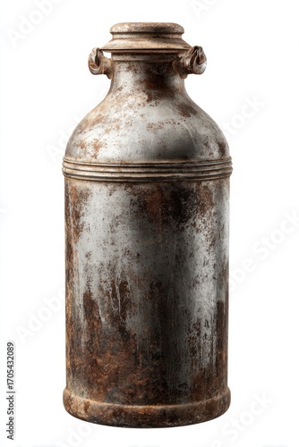Rusty metal milk jug, weathered and aged. A vintage milk container with a slightly rounded shape and visible rust and patina.