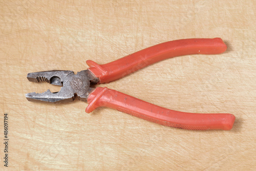 Rusty metal pliers with a red plastic handle on a wooden background.